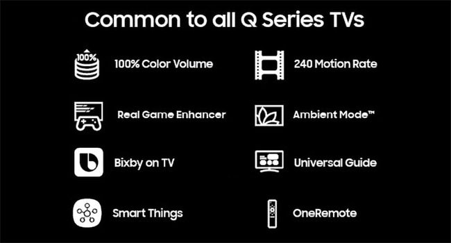 Available on all 2019 Samsung QLED TVsFeatures such as 100% Color Volume, Bixby Voice and Ambient Mode are now standard on Samsung’s QLED TV lineup.